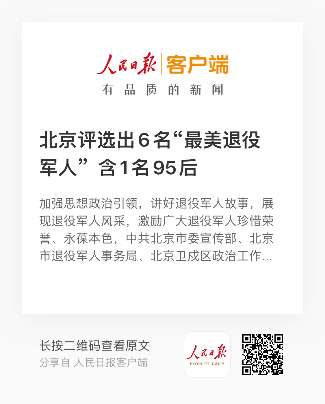 人民日报客户端:北京评选出6名"最美退役军人" 含1名95后