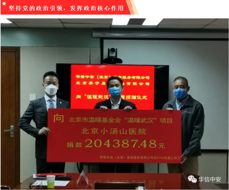 华信中安党委始终坚持党建引领为中心,持续开展思想政治工作,党组织的凝聚力不断增强,党员的先锋模范作用突显,促进了员工队伍稳定和服务质量的提升,赢得了客户信任与支持。2020年抗击疫情,华信中安党委提高政治站位,承担主体责任,号召各级党组织和全体党员把抗击疫情作为政治任务去完成,做到"危难时刻看党员、关键岗位有党员",带动全体员工共同筑牢坚固防线。华信中安集团投入经费600余万元,购买防控物资、建立隔离区、慰问基层官兵、捐助社会机构。2020年12月公安部评选全国保安行业抗疫先进,华信中安集团、党委书记林永强分别被评为先进集体和先进个人。集团行政管理中心主任刘珺珺在抗疫中勇挑重担,担当尽责,被丰台区评为"抗疫之星"。华信中安驻中国国际航空公司首都机场项目是管理部党总支管理二部党支部覆盖单位,党支部书记郑兴带领13名党员主动站在防控最前沿,亮明身份,树立标杆,200多名保安员毫不畏惧,守土尽责,确保了国门安全,受到国家民航局和国航领导高度评价。海外党总支倡议境外党员危难时刻站出来,树立旗帜、标杆,坚守境外海上、陆地各个战场的赵希松、周金魁、余峰、姚志、谷宇鑫等党员以疫情为命令,以防控为义不容辞的责任,严格落实集团部署和客户要求,确保了自身安全和服务客户安全,受到中国驻外机构和企事业单位领导高度赞扬。