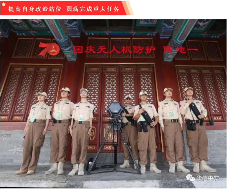 客户单位负责人经常提到,我们之所以选择华信,就是因为你们有党组织、有政工干部,传承了我党思想政治工作的优势,这样的企业政治可靠、值得信赖。为了保障阅兵、庆祝活动核心区低空的绝对安全,2019年4月,由公安部牵头,军队、工信部协同成立无人机联合防控专班,华信中安凭借雄厚的科技沉淀、强大的研发实力、丰富的现场经验、过硬的政治素质、完善的保密体系被选定为国庆70周年阅兵核心区低空防御的重要安保力量。这是一个无尚光荣的使命,这是一个无比艰巨的挑战。为圆满完成党和国家交给的重大任务,面对时间紧、任务重、保障需求特殊等实际情况,华信中安集团成立了以党委挂帅、智能科技公司担纲、保安公司协同的无人机防御工作组,代号"1001"。从人员选拔、背景审查、保密教育、军事训练到装备操作使用、故障排除、突发事件处置,均由党委把关。为加强安全保密工作,党委书记林永强亲自挂帅,担任保密委员会主任,负责保密教育和队员政审,并直接领导无人机技术大队。大队长兼教导员李逢亮在部队服役二十年,拥有本科学历和无人机驾驶《机长证》,航测遥感与测绘中级工程师,退役后长期从事无人机应用领域研究与实战,是全国安保行业的无人机防控专家。经过前期5个多月的实战演练和阅兵期间的战斗值班,华信中安出色地完成了国庆70周年低空安全保障任务,并先后完成了澳门回归祖国20周年庆祝大会会场、北戴河署期安保、总书记赴潮汕地区考察暨深圳经济特区成立40周年庆祝大会、总书记沪苏两地考察等数十项重大政治活动的保障任务,受到公安机关高度赞扬,国庆70周年活动领导小组、公安部、澳门特区治安警察局、北戴河安保指挥部等单位多次通令表彰,并送来锦旗和感谢信。