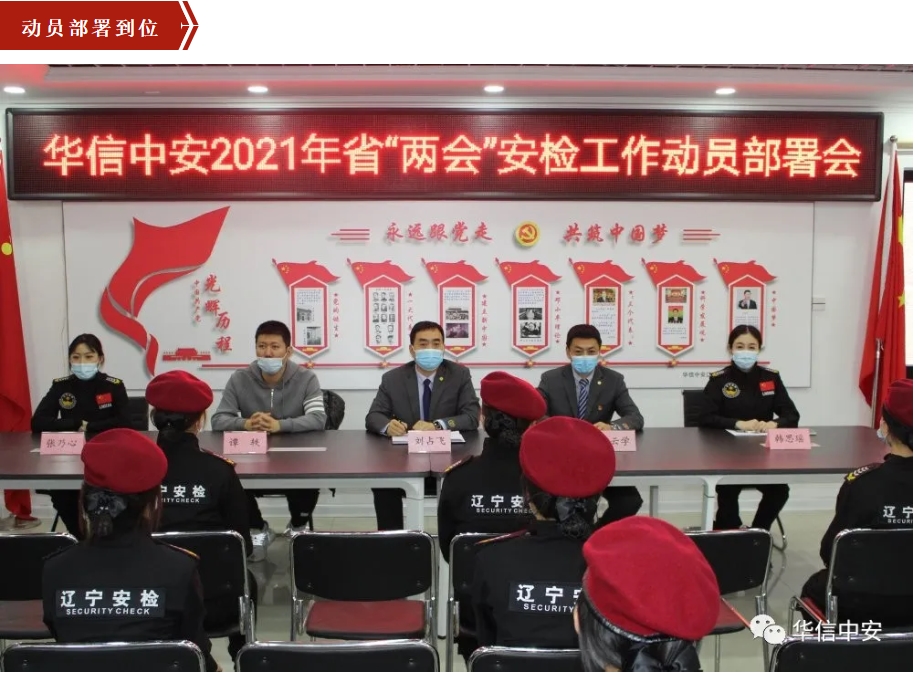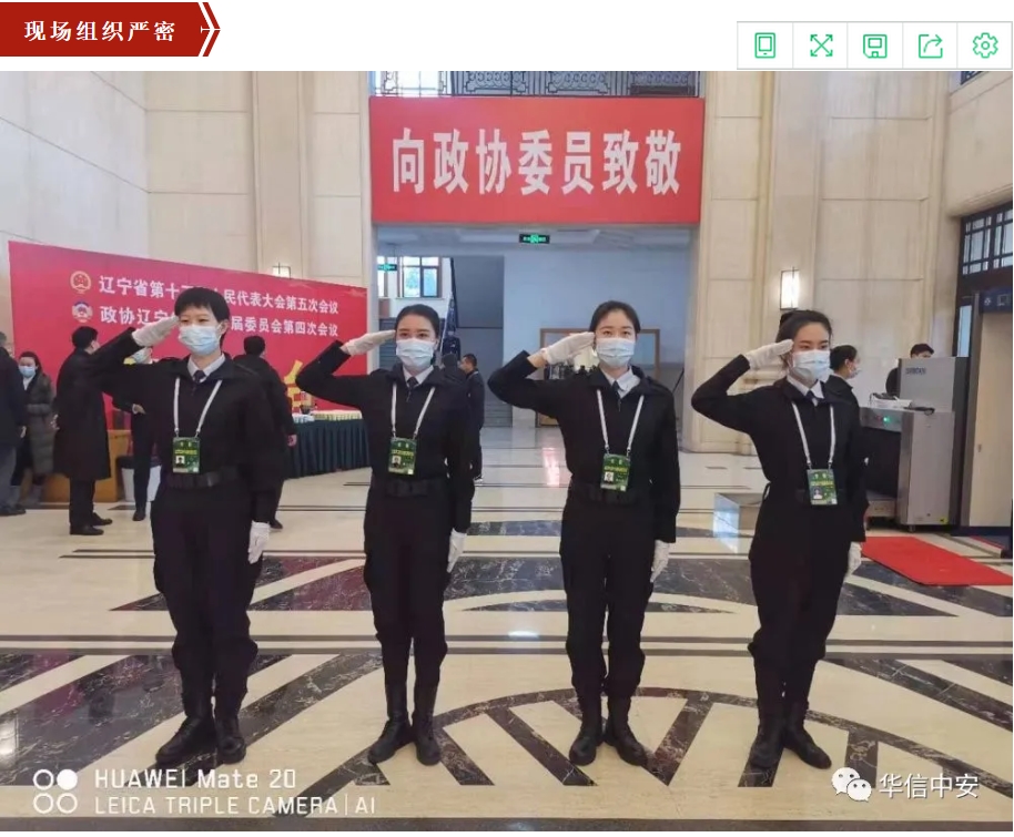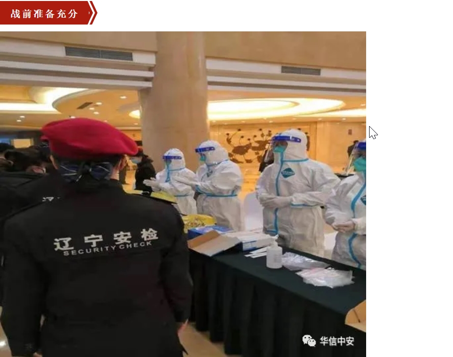 1月27日至30日,辽宁省"两会"在沈阳顺利召开。华信中安(辽宁)保安服务有限公司在辽宁省公安厅保安管理总队的直接领导下,积极配合"两会"警卫组,严格执行会务组关于安检和防疫的各项要求,圆满完成了各项安检任务。