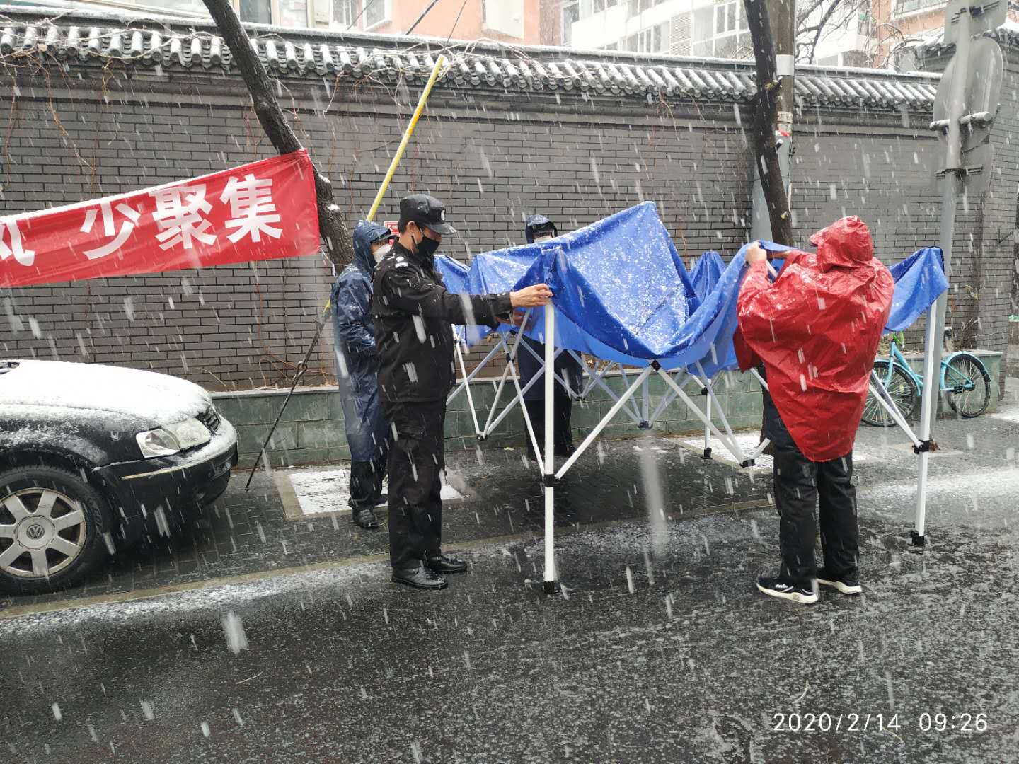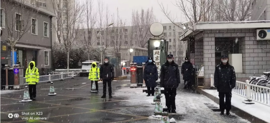 前不久正是抗击新冠肺炎的胶着时期,北京迎来一场久违的大雪,然而大雪并不能驱走肆虐全国的病毒。在这场战疫中华信中安的保安队员不仅肩负着治安巡逻职责,同样也肩负起抗击病毒的重任。14日早9点,华信中安公司驻体育馆路街道办事处金庆余等四名保安在治安巡逻时发现龙潭西里北口新设置卡口的帐篷还没搭建,居委会防疫人员和志愿者们还在风雪中受冻,金庆余看到这一情况后二话没说,带领其他三位保安员立刻帮助防疫人员把帐篷搭好,在场的工作人激动地说:“你们真好,谢谢你们了,要不是你们,我们还得站在雪水里挨冻,登记本都湿了,你们辛苦了!”金庆余说:“你们也辛苦,在疫情面前这是我义不容辞的责任,沒关系,为人民服务,咱们共同战胜疫情。”