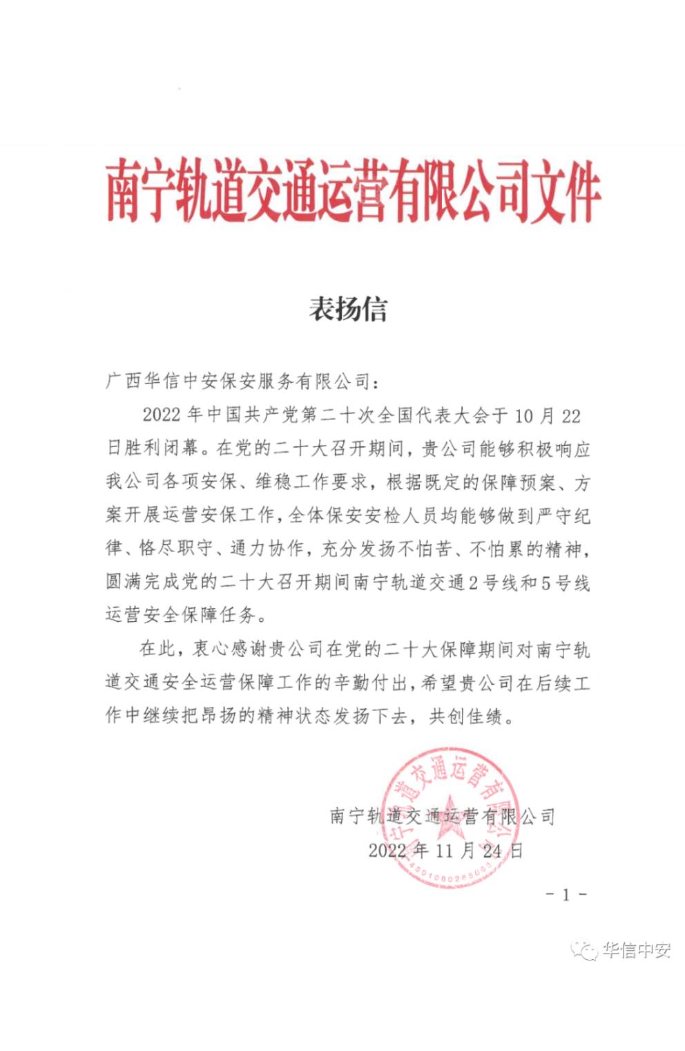前不久,南宁轨道交通运营有限公司专程向广西华信中安保安服务有限公司发来表扬信,对广西华信中安保安服务有限公在党的二十大召开期间,极响应南宁轨道交通运营有限公司各项安保、维稳工作要求,根据既定的保障预案、方案开展运营安保工作,全体保安安检人员均能够做到严守纪律、恪尽职守、通力协作,充分发扬不怕苦、不怕累的精神,圆满完成党的二十大召开期间南宁轨道交通2号线和5号线运营安全保障任务提出表彰。