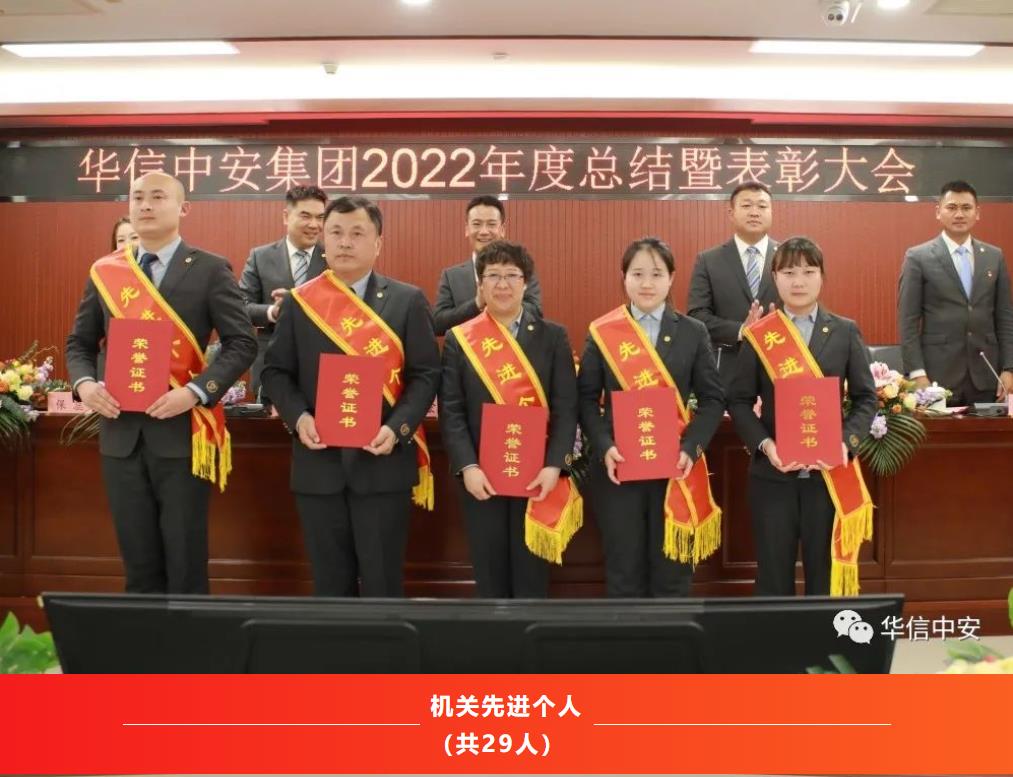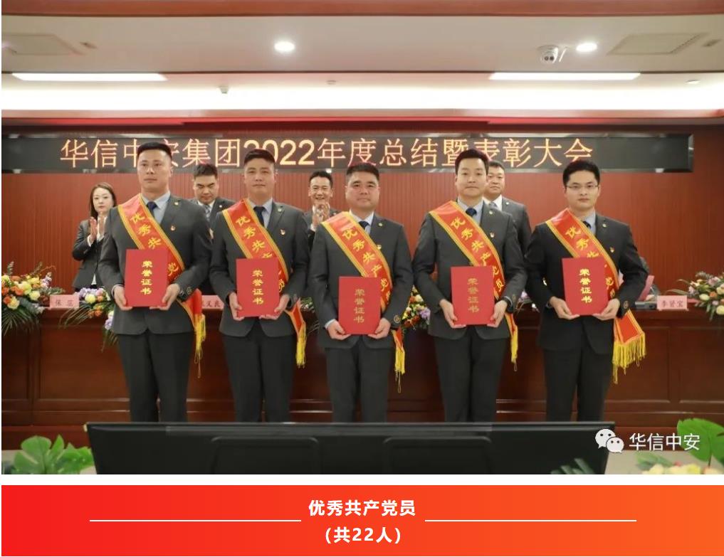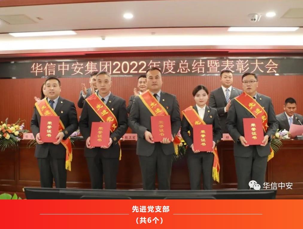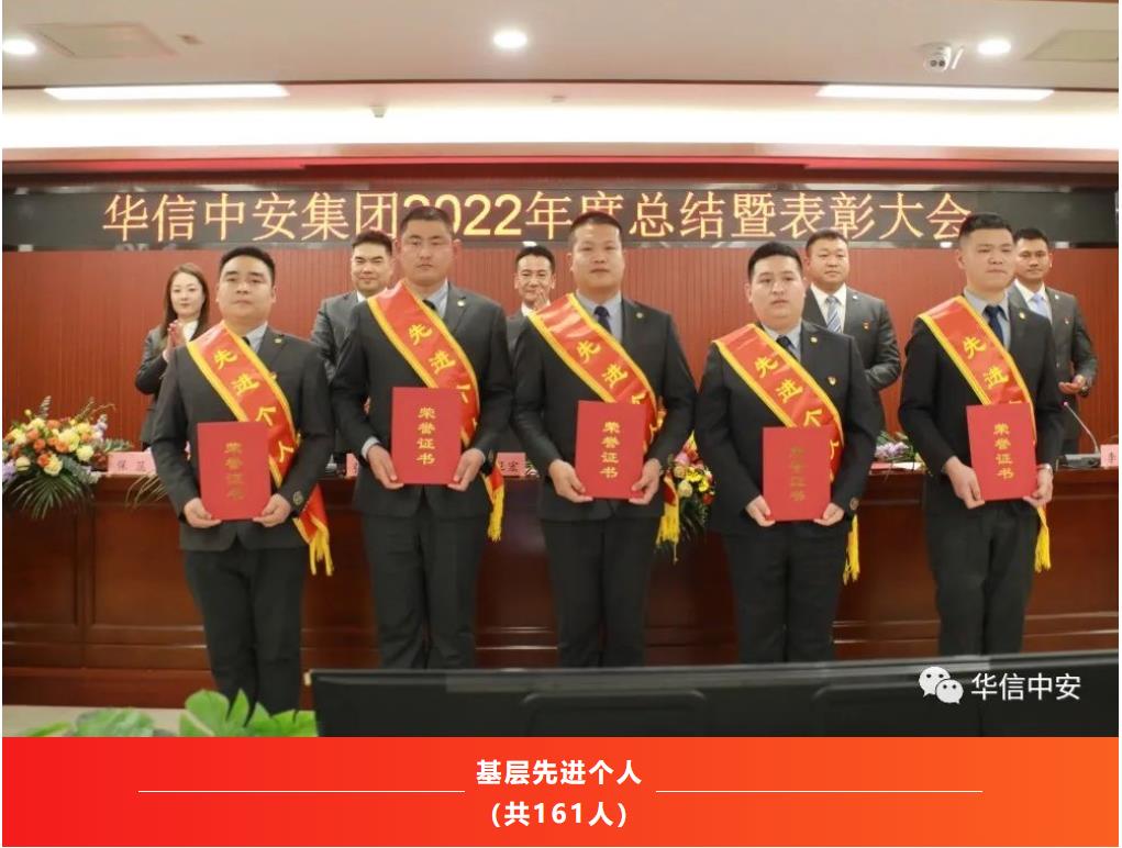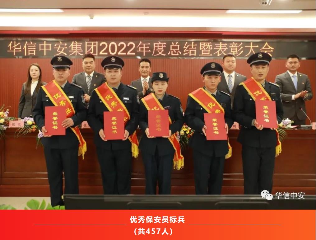 2022年,是异常艰难的一年,是充满奋斗的一年,也是铸就辉煌的一年。一年中,在集团各个工作岗位上,涌现出了一大批忠于职守、兢兢业业、勇挑重担的优秀基层管理干部和优秀保安员,他们用实际行动诠释着新时代华信中安人的风采,会上,集团保安运营管理中心总监、公司总经理邢鹏同志宣读了《2022年度华信中安集团先进集体和先进个人表彰决定》:经民主评议和各单位推荐,报请集团党委和集团办公会研究决定评选出先进党支部5个;抗疫先进党支部1个;优秀共产党员22人;集团机关先进集体9个;全国分支机构先进集体15个;基层先进集体59个;机关先进个人29人;全国各分支机构先进个人34人;基层先进个人161人;优秀保安员标兵457人。