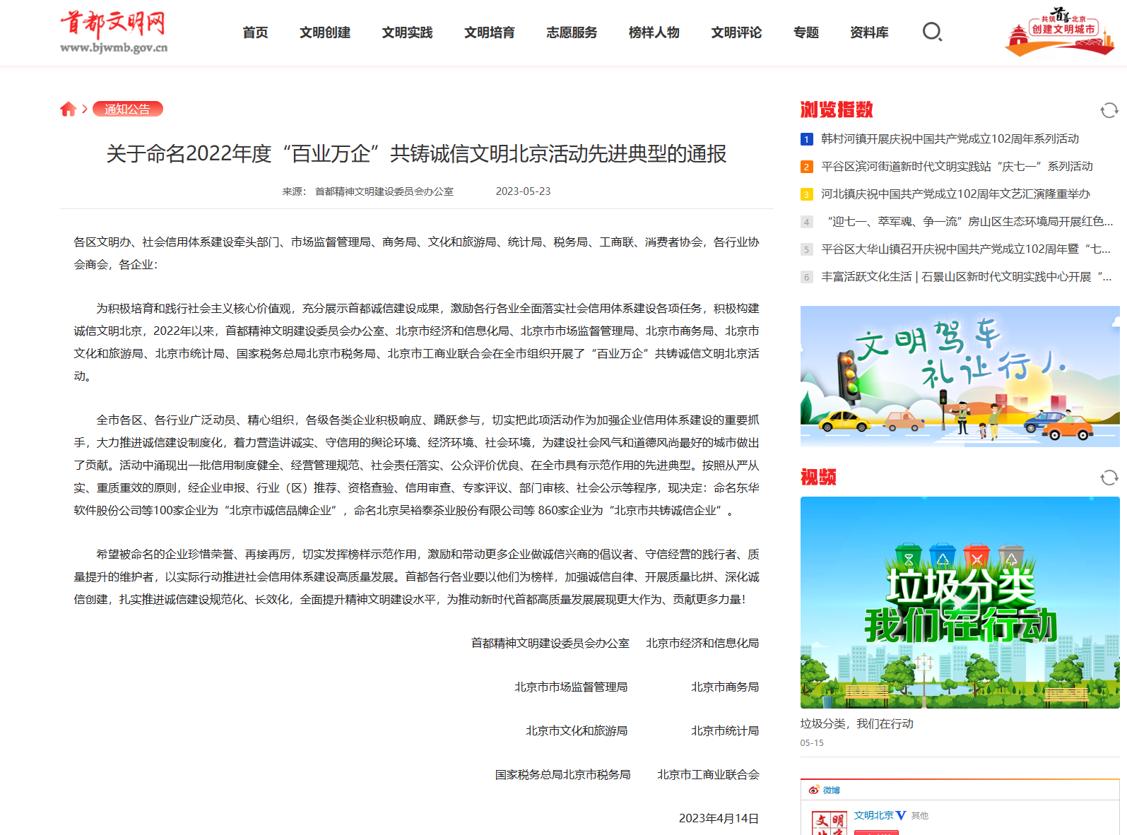 “百业万企”共铸诚信文明北京活动自2022年启动,旨在充分展示首都诚信建设成果,激励各行各业全面落实社会信用体系建设各项任务,积极构建诚信文明北京。经过资格查验、信用审查、专家评议、部门审核、社会公示等一系列程序,公司凭借信用制度健全、经营管理规范、社会责任落实、公众评价优良等优势,成功评为“北京市共铸诚信企业”,成为北京市百万企业中具有示范作用的先进典型。